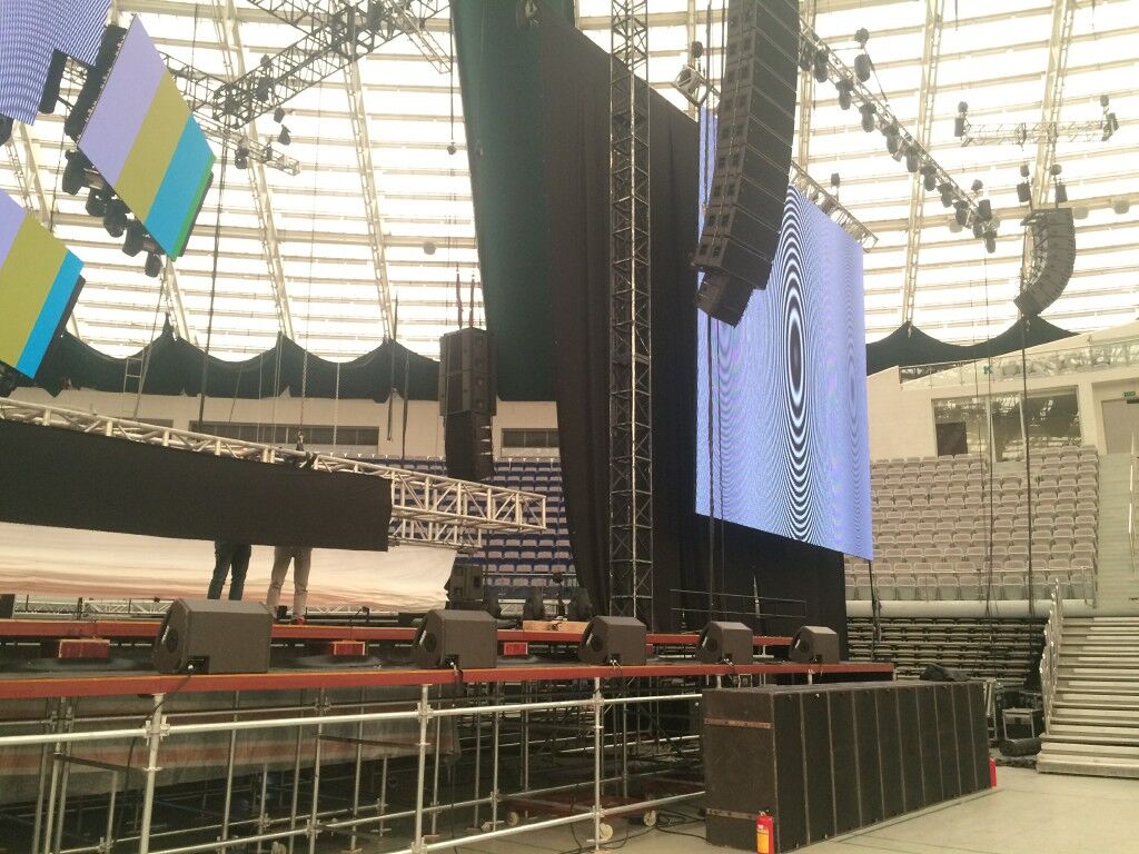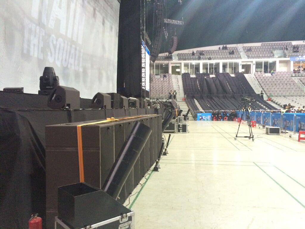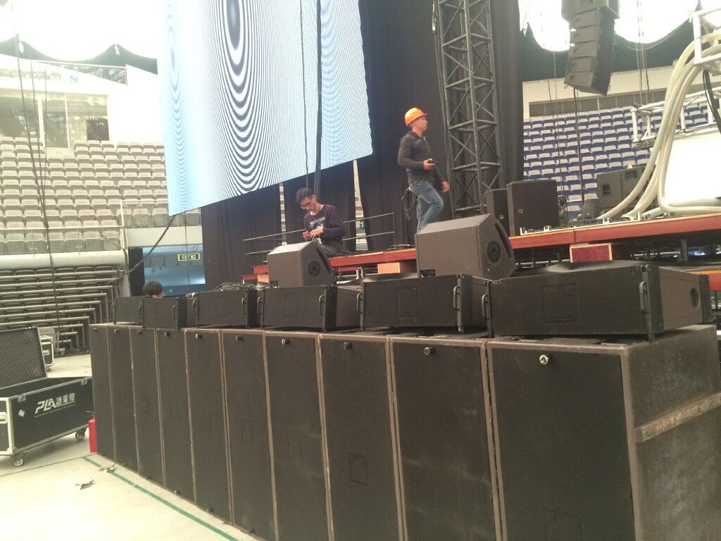 主擴音箱采用了L-Acoustics V-DOSC雙十五寸線陣列音箱24隻和L-Acoustics dV-DOSC雙八寸線陣列音箱8隻組成;